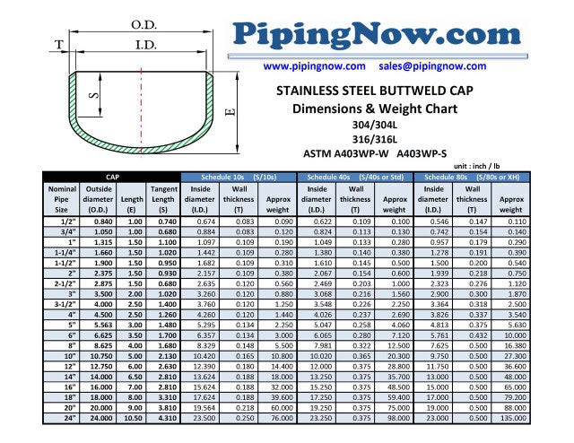 Stainless Steel Buttweld Fitting Dimension & Weight Info