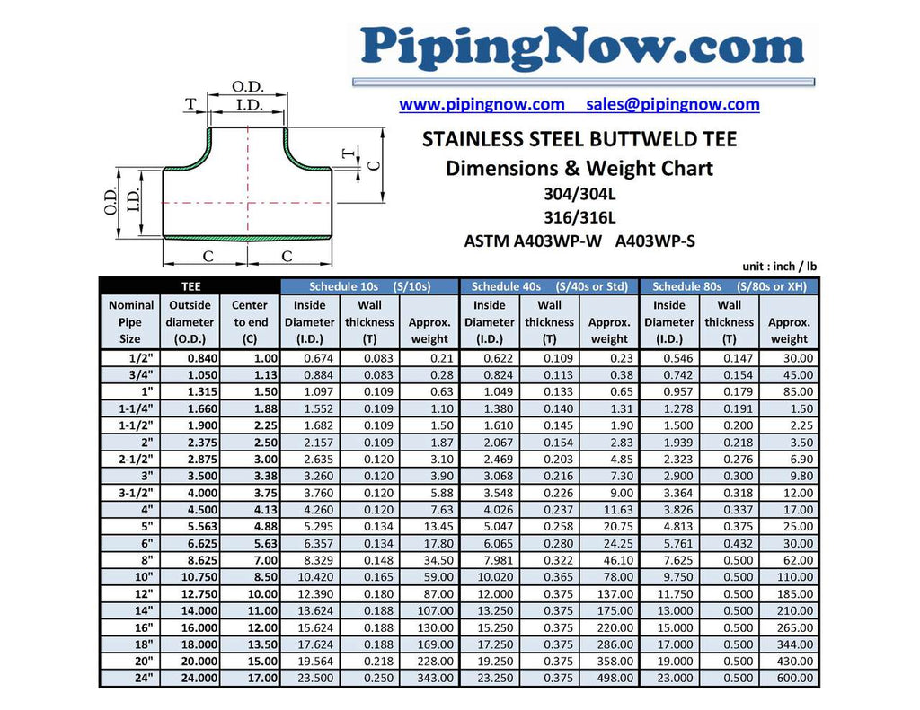 Stainless Steel Buttweld Fitting Dimension & Weight Info