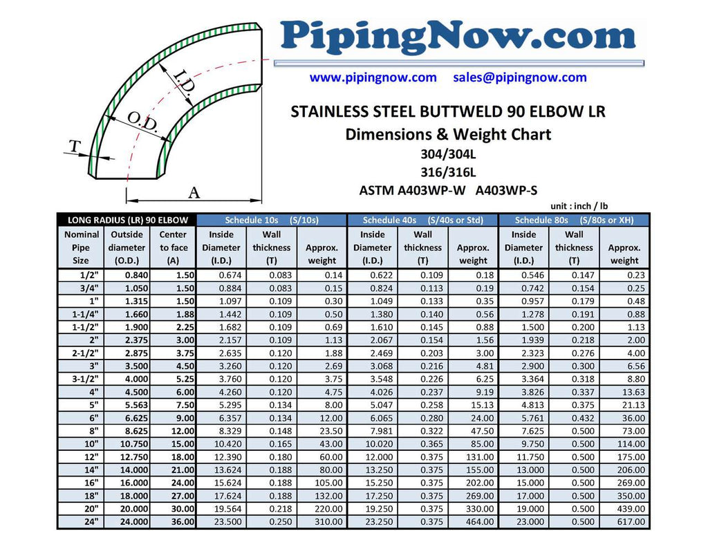 Stainless Steel Buttweld Fitting Dimension & Weight Info